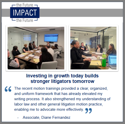This week, our newer Associates gathered for an in-depth motion training session, sharpening their skills in drafting, strategy, and preparing for oral argument. It was great to see everyone engaged which assured us that workshops are an important part of our ongoing commitment to professional development and excellence in advocacy.
