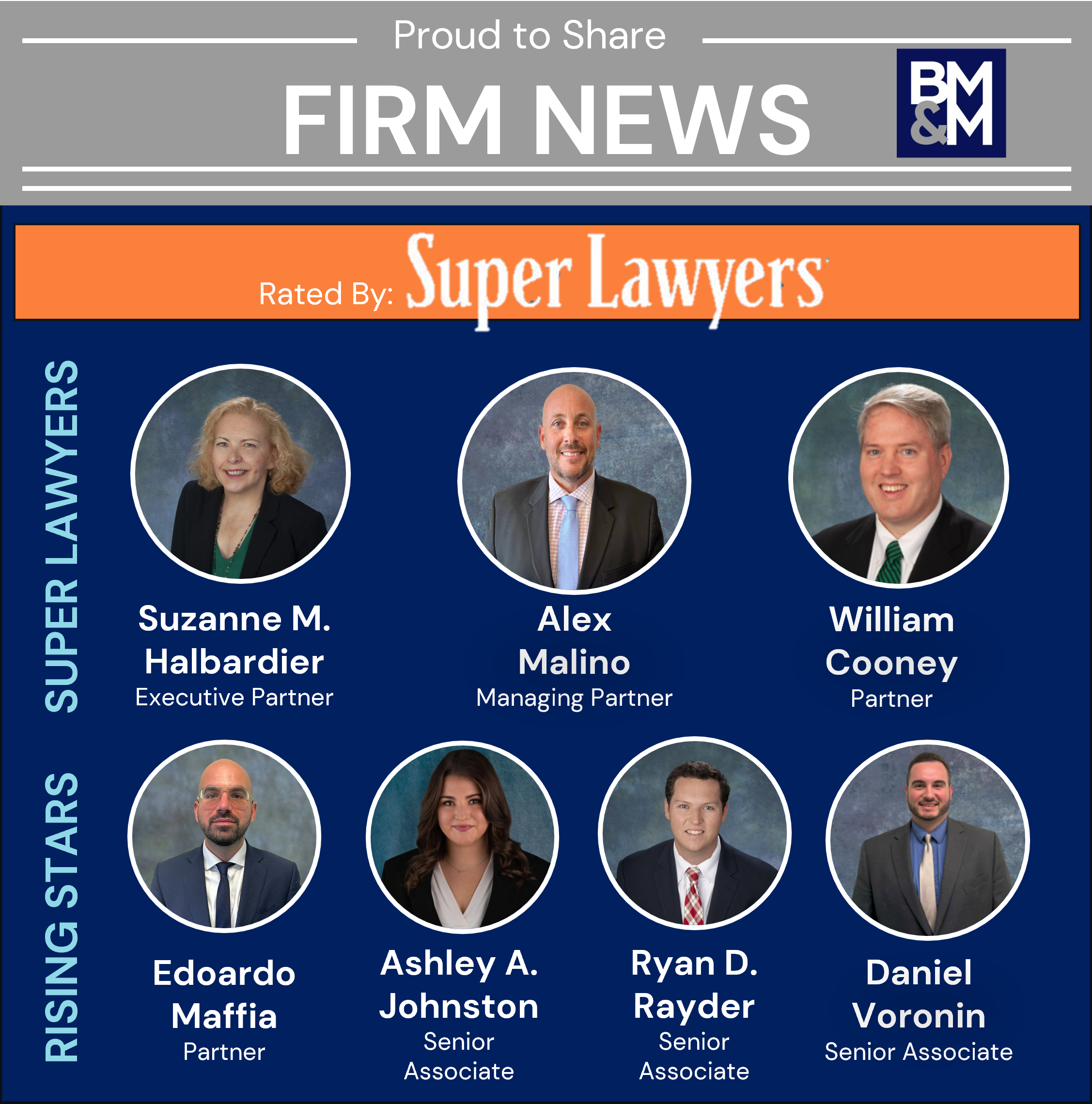 Congratulations to our firm’s owners, Suzanne Halbardier and Alex Malino, along with Partner Bill Cooney, on being named Super Lawyers. This distinction reflects not only their legal expertise, but the leadership and standard of excellence they bring to BMM every day.